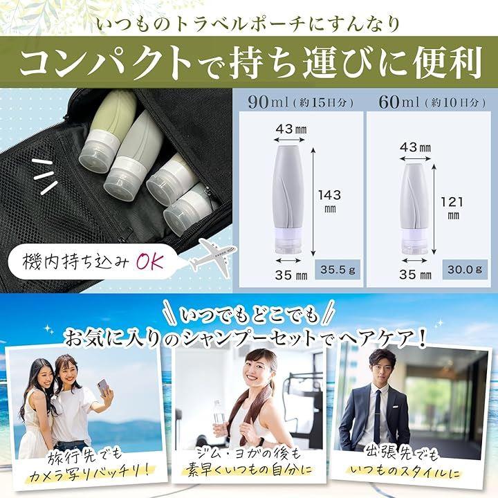 「機内持ち込みOKのコンパクト設計」iYUZUのトラベルボトルでお気に入りのシャンプーセットをラクラク持ち運びできます。