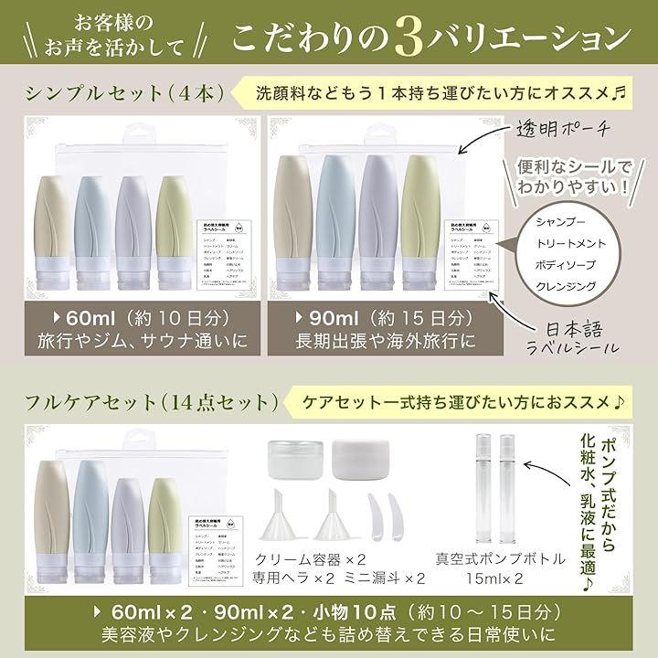 シリコンボトルが「4本」あるからハンドソープや洗顔料など「もう一本」持ち運びたい方にオススメ。美容液や乳液などのケアセット一式も持ち運びたい方にはクリーム容器や真空式ポンプボトルのついた14点セットをご用意。全セットに便利でわかりやすい日本語ラベルシール付。