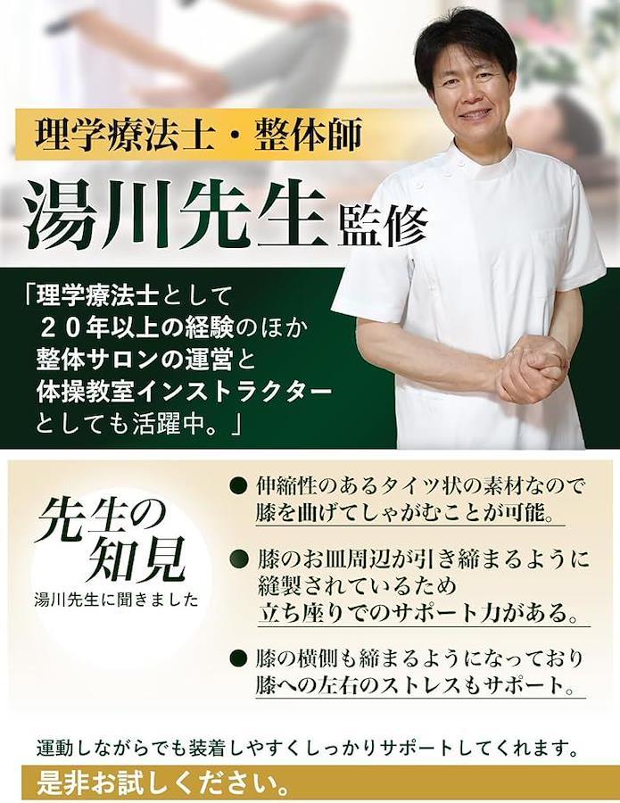 ・伸縮性のあるタイツ状の素材なので、膝を曲げてしゃがむことが可能・膝のお皿周辺が引き締まるように縫製されているため、立ち座りでのサポート力がある・膝の横側も締まるようになっており、膝への左右のストレスもサポート。