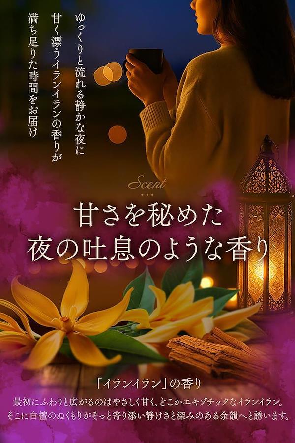 その後、イランイランの甘くどこか奥にひそむ深みのある香りがふわりと漂い、感覚をそっとほどいてくれるうつろいをお楽しみください。