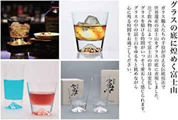 ガラス職人の手技が冴える伝統技法でなんと世界遺産の富士山をグラスの底に入れました。 ウィスキー、カンパリ、ブランデー、カルーア、etc。飲み物によって色の違う富士山が見えますので、何をどうして飲んでみようかと迷う楽しみがあります。