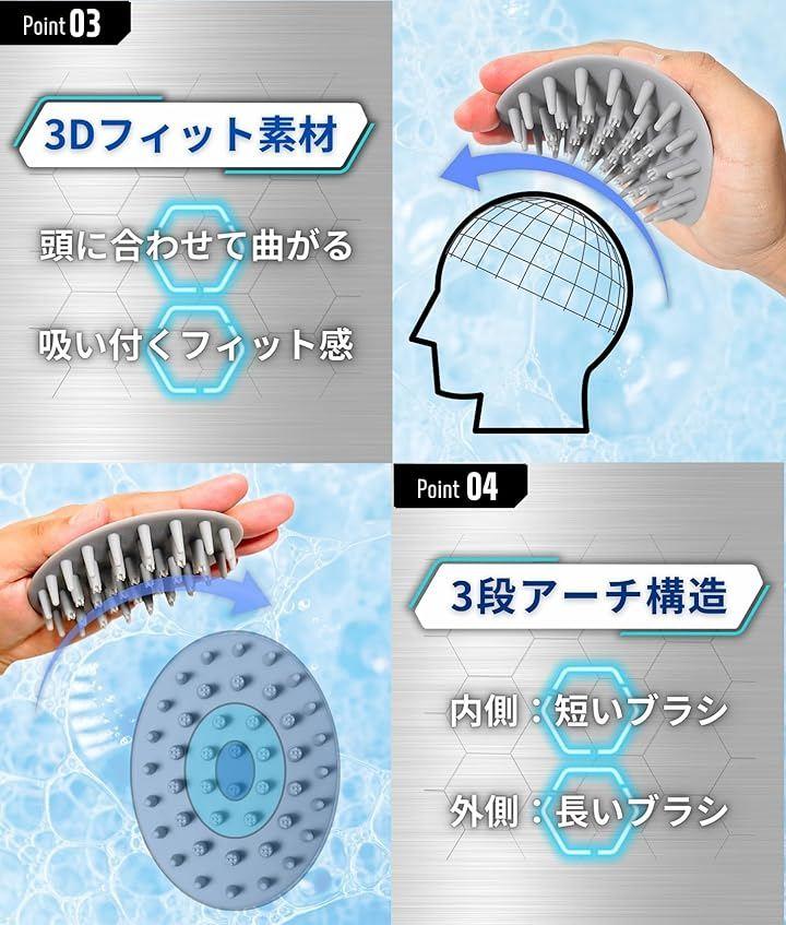 「頭皮にフィット。」人間工学に基づく柔軟設計。頭皮マッサージにも。