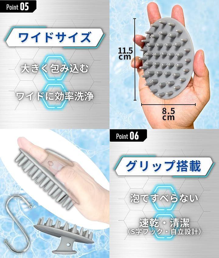 「速乾。清潔。」シリコン一体型シャンプーブラシ。水が入り込む隙間がなく衛生面にも配慮。