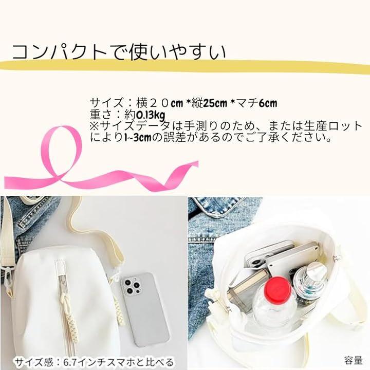 ・「手触りが良くて耐摩耗性に優れた素材」材質:塩化ビニル/ナイロン--サイズ:横20cmx 縦25cm xマチ6cm---カラー4色:ブラック、パープル、ピンク、ベージュ 重量:0.13kg ・「コンパクト&小物収納」」色んな持ち方―2wayで使い分け:肩掛け、斜め掛け メイン収納とファスナーロポケット付き、ハンカチ、ポーチ、スマホなど最低限必要なものをコンパクトに収納します。