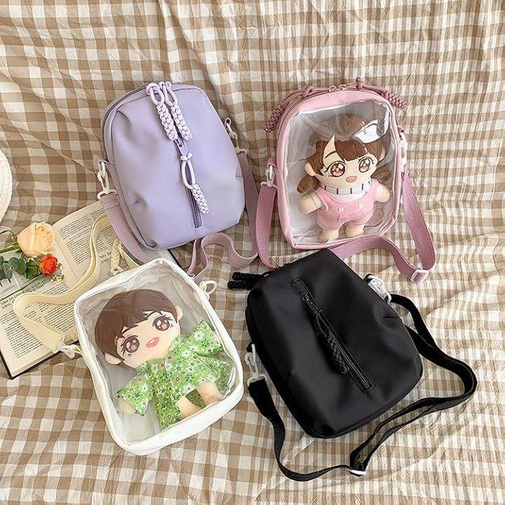 アニメやアイドル・ゲームなどのキャラクター缶バッジをバッグにに付け、推しへの愛を表現するアイテムになってるよ。背面は小物や財布など見えないように収納できます。