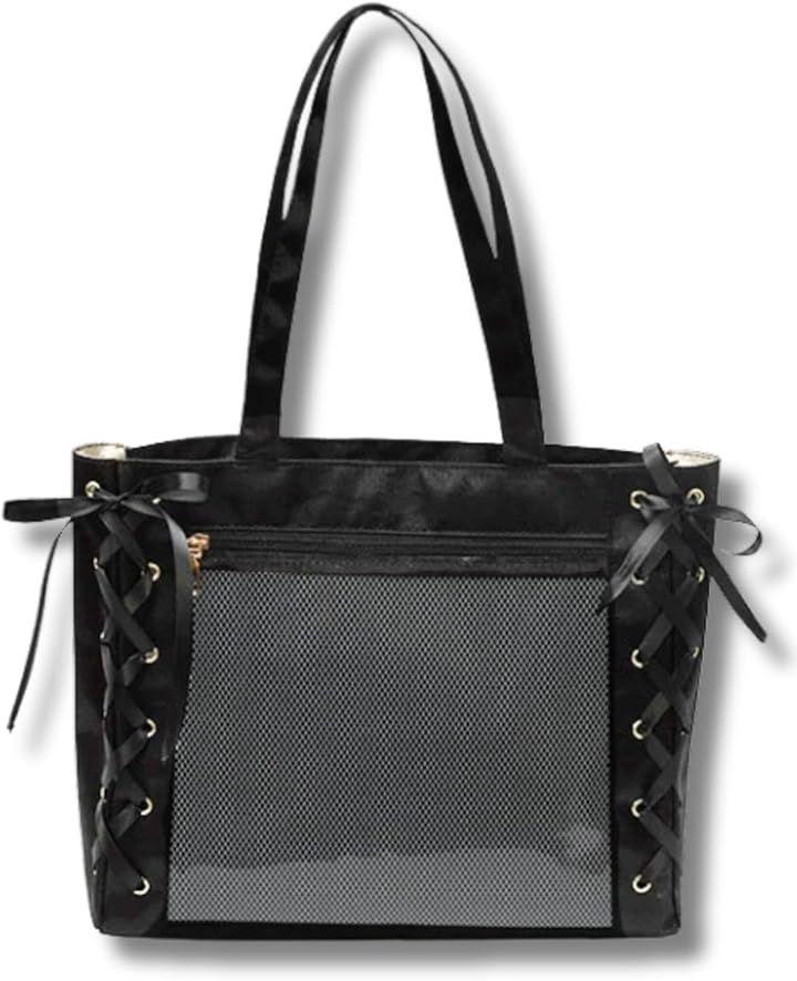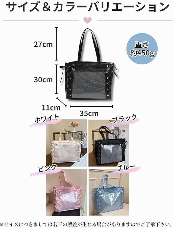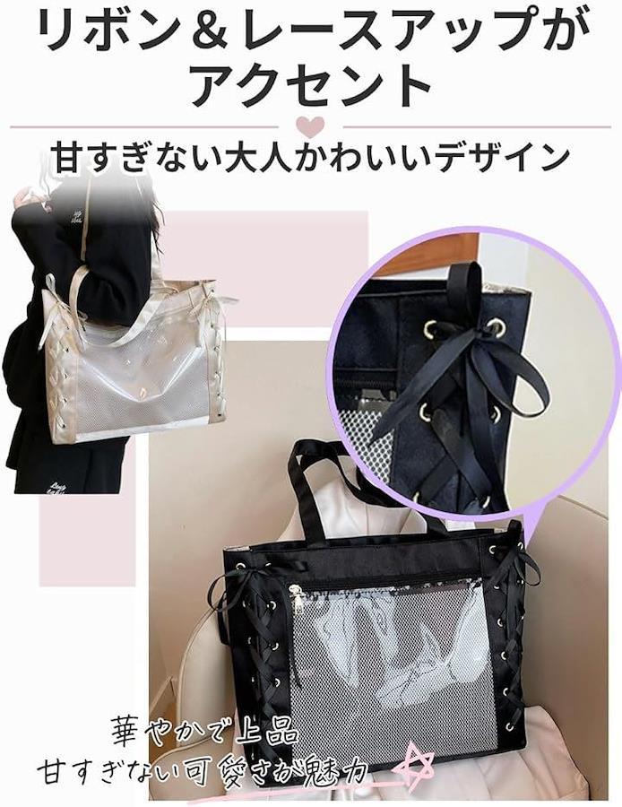 「華やかなリボンデザインで魅せるトートバッグ」サイドにあしらわれたレースアップのリボンが印象的な、女性らしいトートタイプの痛バッグです。