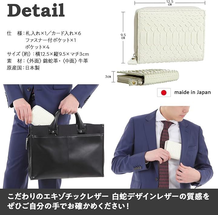 「 スペック 」札入x1 カード入れx6 ポケットx4 ファスナー小銭入れx1 SIZE:(約)横12.5x縦9.5xマチ3 cm 素材:(外面)錦蛇革(中面)牛革 日本製(高級・総ハンドメイド品) *天然蛇革皮革(エキゾチックレザー)の為、一つ一つの鱗(ウロコ)模様などが画像とは若干異なります。