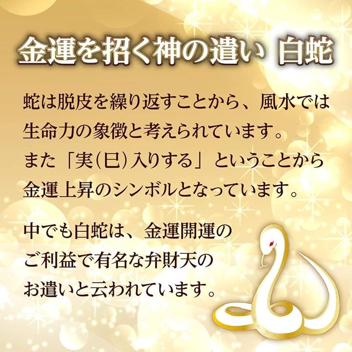白蛇は古来より金運蓄財の神、七福弁財天様の遣いとされ、日本で広く信仰されている金財神です。