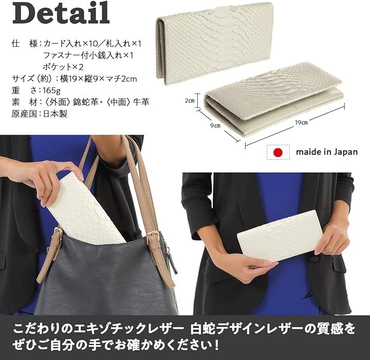 「 整理と出しやすさを追求した被せ型 スリム 長財布 」札入x1・カード入x8・ファスナーポケットx1・ポケットx2 、SIZE:(約)横19x縦9xマチ2cm、素材:(外面)錦蛇革(中面)YKKファスナー使用、日本製、レディース・メンズ長財布