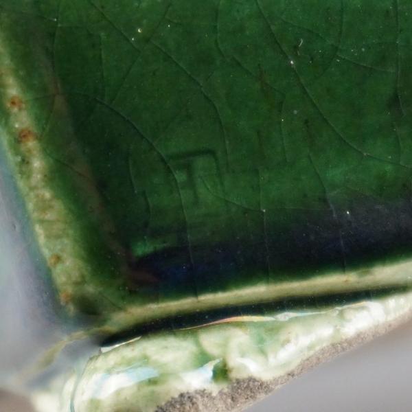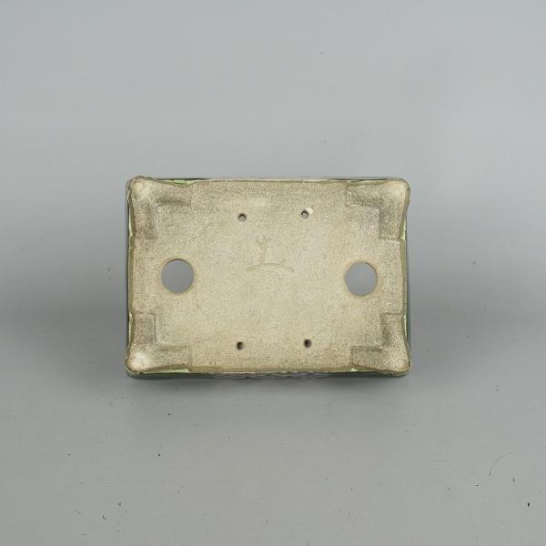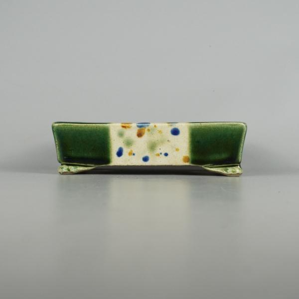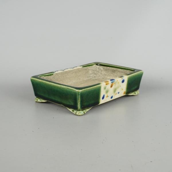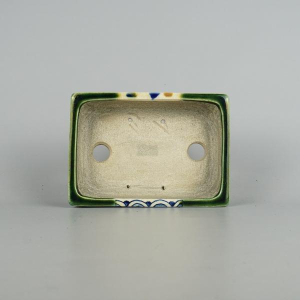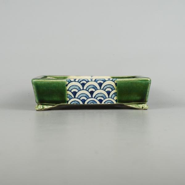 Small bonsai pot by Satomi Terahata Touen, approximately 15.5cm long, rectangular, with a cloud-foot design and wave motif, glazed with Oribe glaze. Brand new, limited quantity.