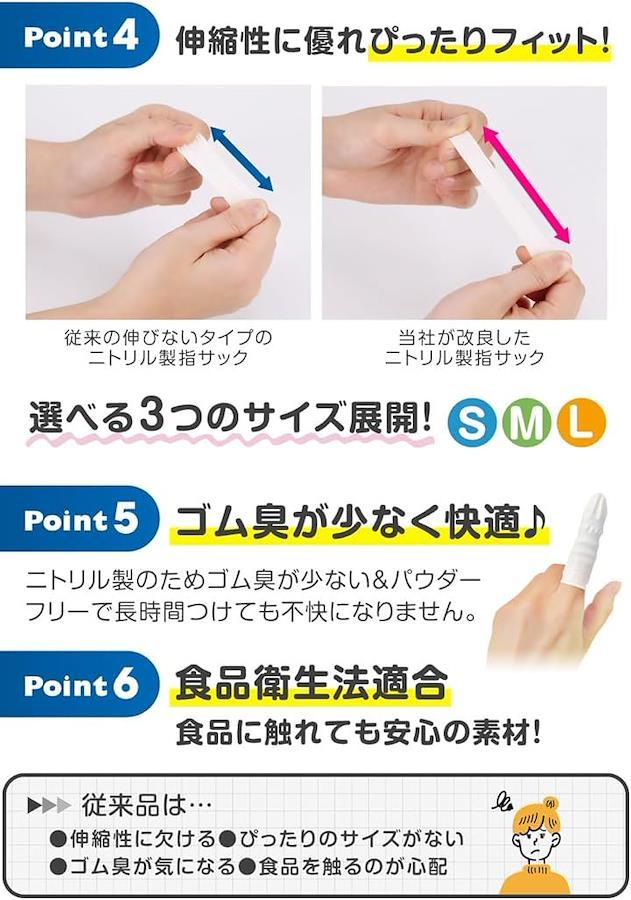 「指先にぴったりフィット」既存のニトリル製指サックの伸縮性を改良し、よりフィットする仕様にしました。
