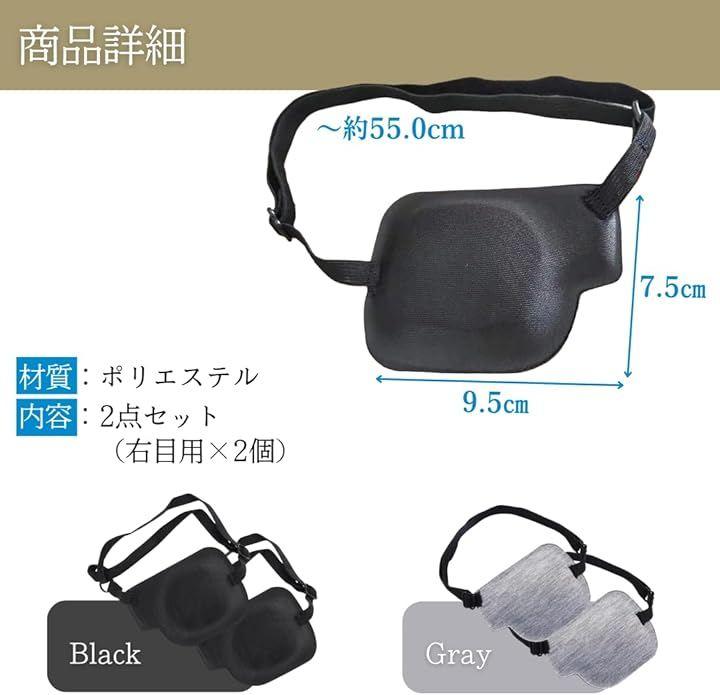 「商品詳細」セット内容:2点セット(右目用x2個) サイズ:9.5cmx7.5cm ストラップ調節範囲:~約55.0cm 材質:ポリエステル カラー:グレー / ブラック