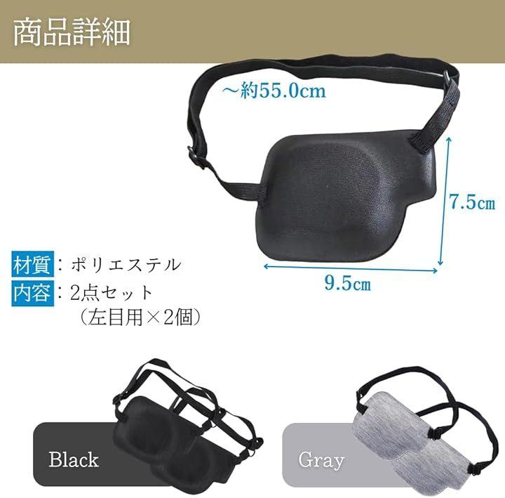 「商品詳細」セット内容:2点セット(左目用x2個) サイズ:9.5cmx7.5cm ストラップ調節範囲:~約55.0cm 材質:ポリエステル カラー:グレー / ブラック