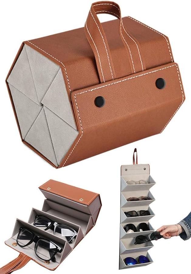 ・外側は水滴や雨からでもしっかり中の眼鏡を守るPUレザーを使用、内側は大事な眼鏡を傷つけない滑らかなスエード生地で構成され、6本収納でもコンパクトにまとめて収納できます。