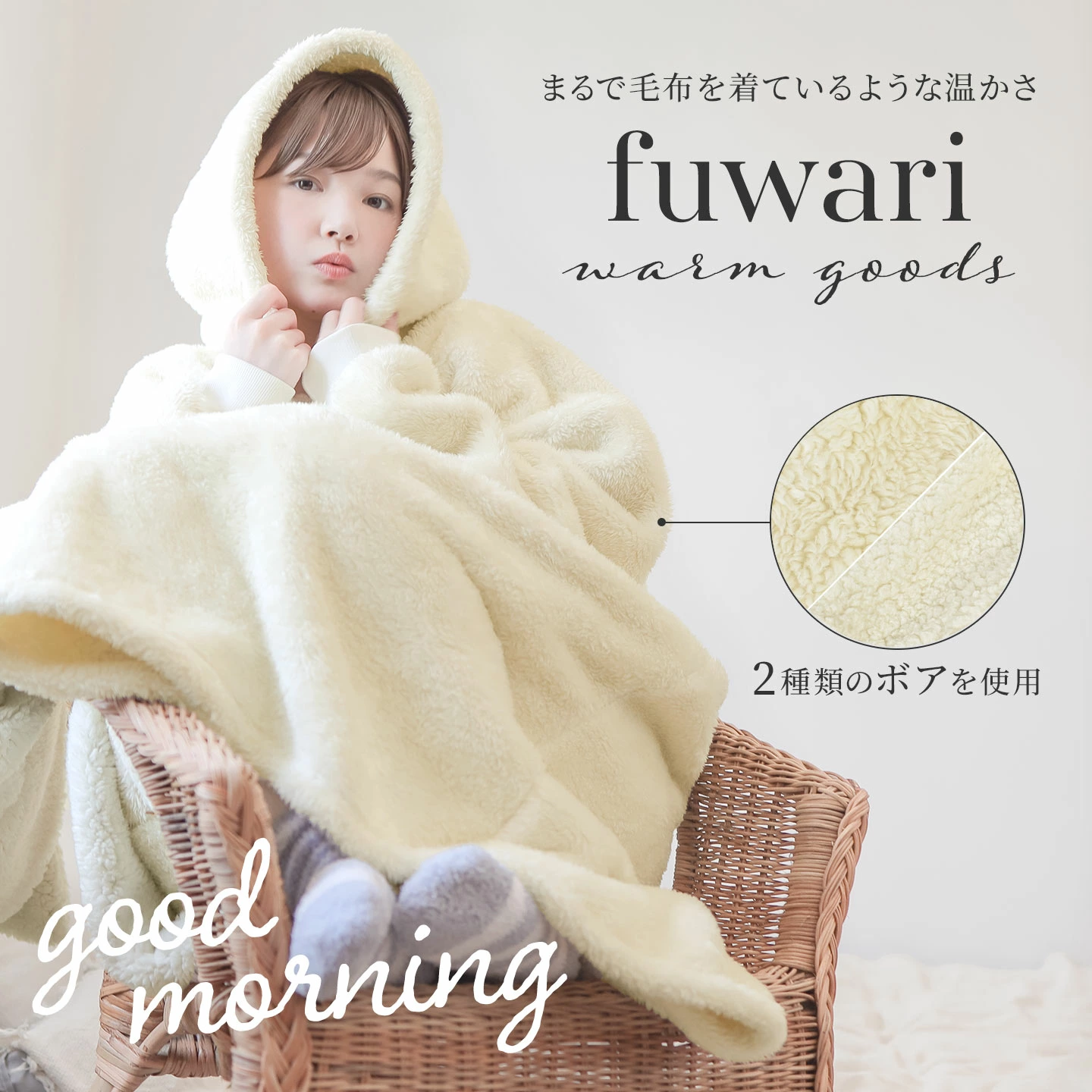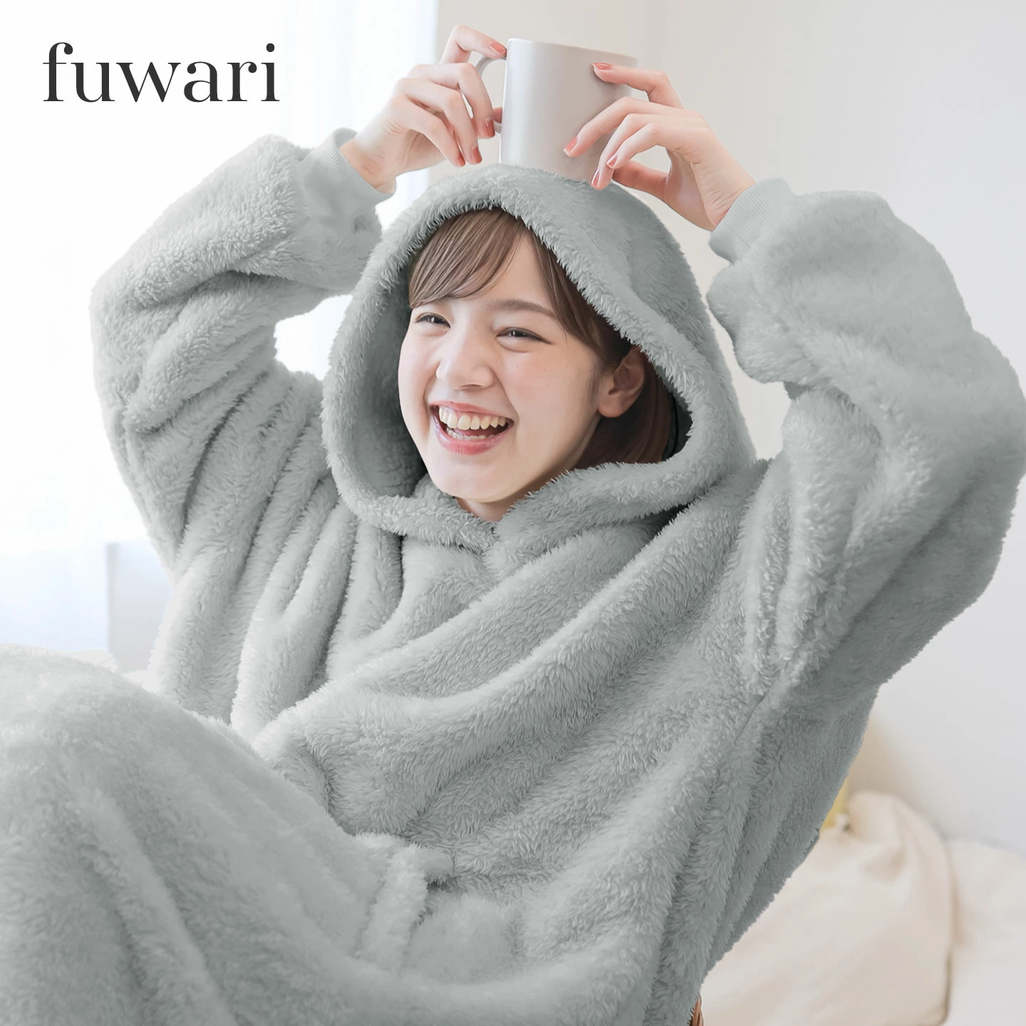 【fuwari 着る毛布パーカー】まるで毛布を着ているような温かさ。一枚生地で2種類のボアを使用。裏面はシープボアで保温性を、表面ボアは肌触りを重視。一枚生地にすることで、両面起毛のふんわり軽い毛布になりました。おうちで使用するのはもちろん、アウトドアシーンにも大活躍すること間違いなし!
