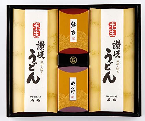 包丁切りの半生うどんにめんつゆ、かつお節をセット。上品なパッケージに入っているのでご贈答だけでなくご婚礼用としてもお使いいただける人気の商品です。半生うどんは切った麺を少し乾燥させたものです。生めんのモチモチ食感を残しつつ、日持ちが常温で3か月と、ご家庭用としても取り扱いしやすい商品です。