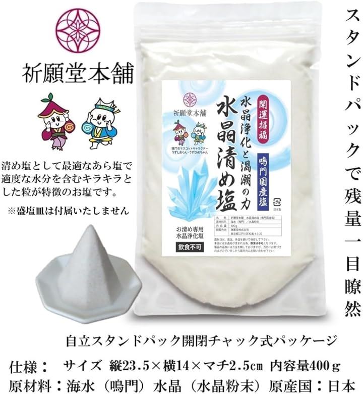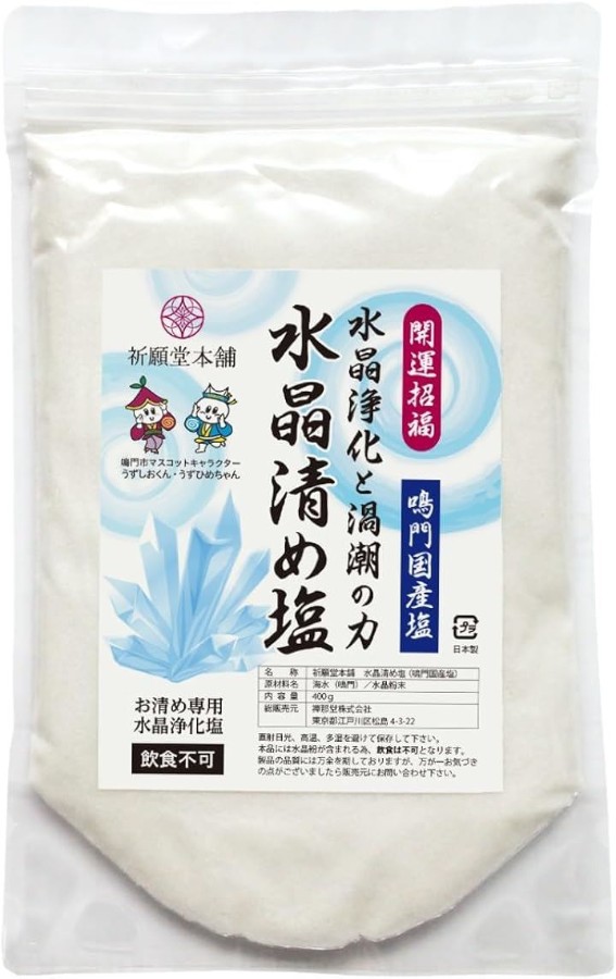 水晶と大ウズシオがシンボルのパッケージは湿気を防ぎ何度使用しても、開閉しやすいチャック式で、保管しやすく残量が一目で分かる自立式、 透明スタンドパックを採用した「祈願堂 本舗」ブランドが誇る浄化、お清めの塩です。