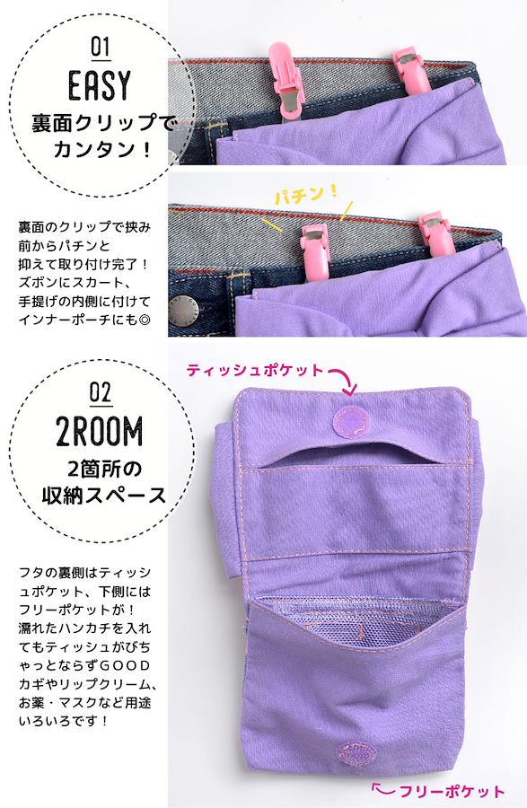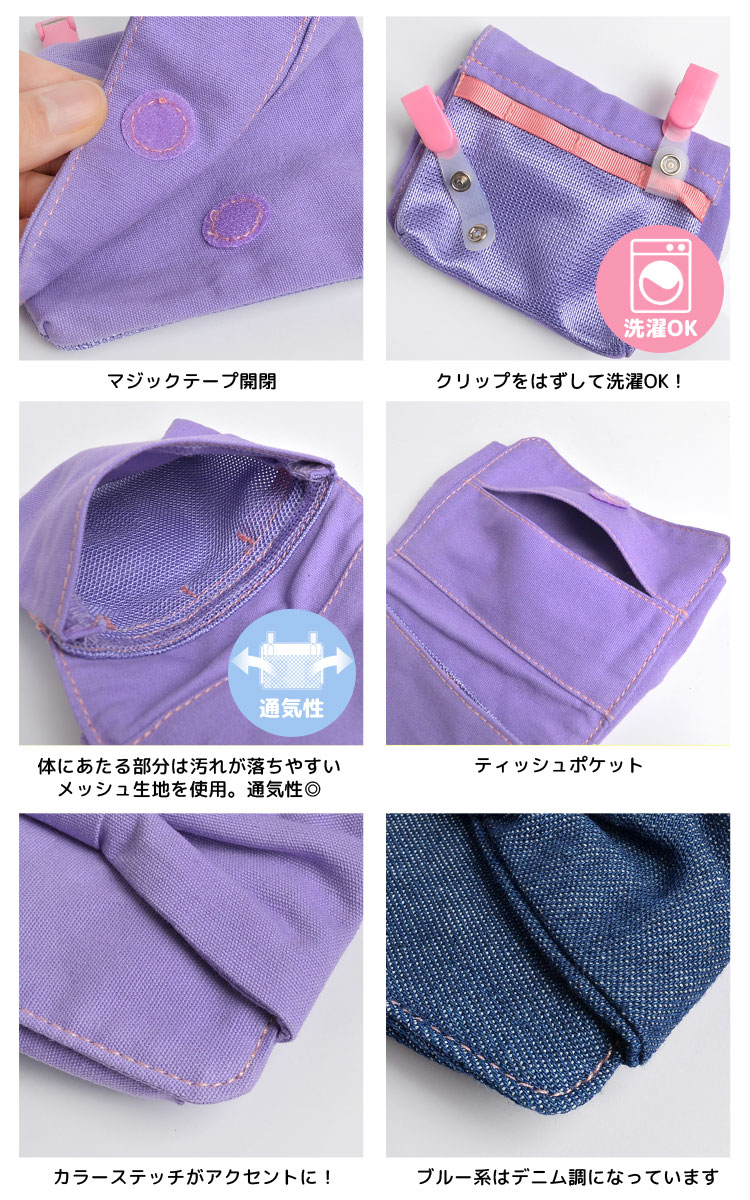 ■仕様●裏面には汚れが落ちやすく、通気性抜群のメッシュ素材を使用。●ポケットのない服や、レッスンバッグなどに付けることも可能●ティッシュポケットとフリーポケットの2か所の収納●クリップをはずして本体のみ洗濯ok