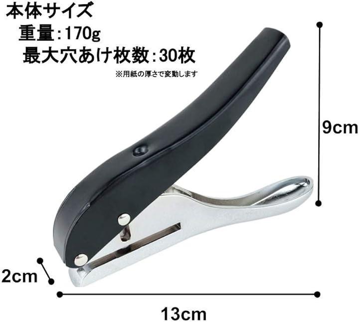 「商品詳細」穴開け直径6mm、長さ13cm、高さ9cm、幅2cm、重量約170g、最大枚数:30枚(用紙の厚さで変動します)