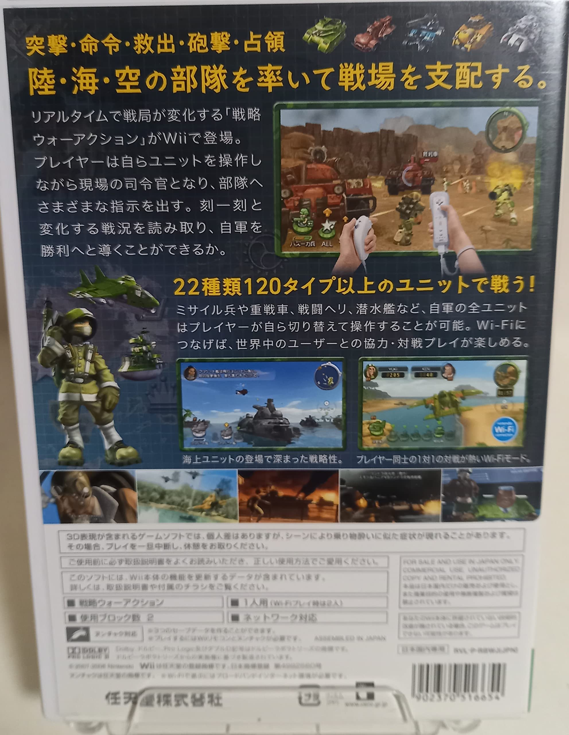 ●陸海空の舞台を率いる戦略ウォーアクションリアルタイムアクションゲーム「突撃!!ファミコンウォーズ」がWiiに登場。プレイヤーは、司令官のようにさまざまな兵士や兵器(ユニット)からなる小隊を指揮しながら敵軍に挑みます。●20種類以上のユニットミサイル兵やバズーカ兵、戦車や戦闘機の他、戦艦や潜水艦などの海軍ユニットも登場。状況に応じて数々のユニットを使い分けます。●複数のユニットを同時に指揮戦車で敵の兵士を攻撃しながら、戦闘機では敵の施設を攻撃するなど、同時に複数のユニットに指示を出すことができ、戦略次第でさまざまな展開が楽しめます。●3種類のWi-Fiモード(2人プレイ)世界中のプレイヤーと3種類のWi-Fiモードをプレイできます。「だれか」と「フレンド」の選択が可能です。「協力マッチ」相手と協力してミッションクリア。「攻防マッチ」攻めと守りに分かれて対戦。「合戦マッチ」相手を攻撃して得られるポイントを競う。