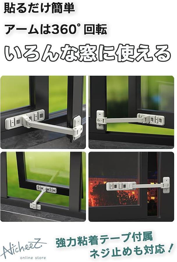 「取り付け簡単」アームの根元部分は360度調節でき、滑り出し窓、引き違い窓、倒し窓など様々なタイプの窓に取り付けが可能。