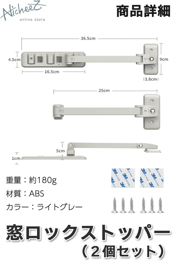 「商品内容」 窓ロックストッパー2個セット 材質:ABS カラー:ライトグレー サイズ:取り付け部 横/約16.5cm 縦/約4.5cm アーム長さ/約25cm アーム取り付け部 横/約3.8cm 縦/約9cm 重量:約180g *低価格での販売実現のため、簡易梱包にて商品お届けの場合がございます。