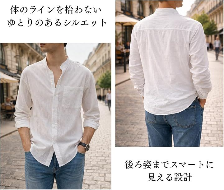 商品仕様 ・タイプ:メンズ シャツ / 長袖シャツ ・襟タイプ:スタンドカラー(バンドカラー) ・素材:薄手生地(通気性素材)100% 植物繊維(綿麻) ・シルエット:ゆったり ・ポケット:胸ポケットあり ・季節:春 / 夏 / 秋 ・カラー:ホワイト / ブラック