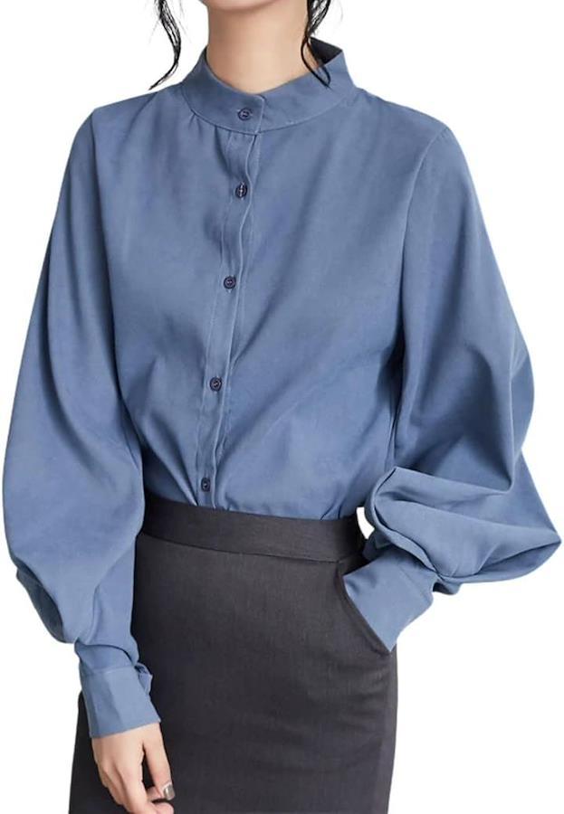 「立ち襟ブラウスレディース上品で知的な印象」 首元をすっきり見せる立ち襟デザインは、清楚で洗練された雰囲気を演出。