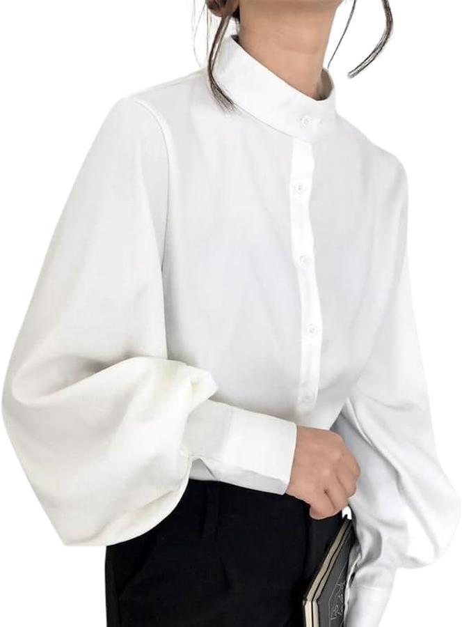 「立ち襟ブラウスレディース上品で知的な印象」 首元をすっきり見せる立ち襟デザインは、清楚で洗練された雰囲気を演出。