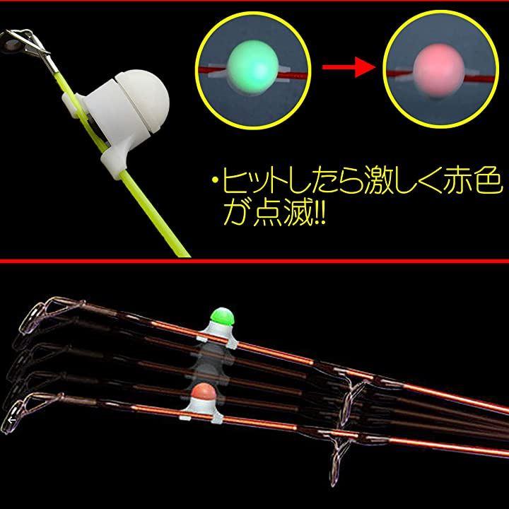 ロッドのしなりを感知して緑色>赤色(点灯の種類は2種類ご用意しております)と変化して激しく赤色が点滅するので一気に緊張が走ります。
