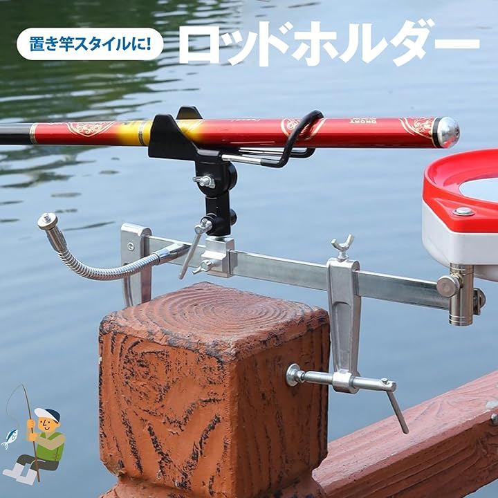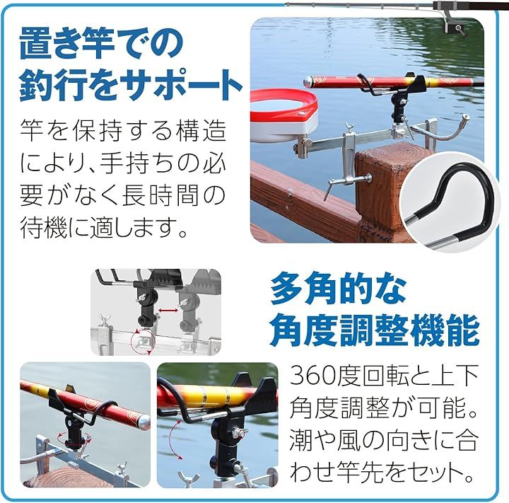堤防の手すりや公園のフェンス、船べり等にガッチリと固定できる竿受けです。