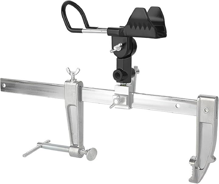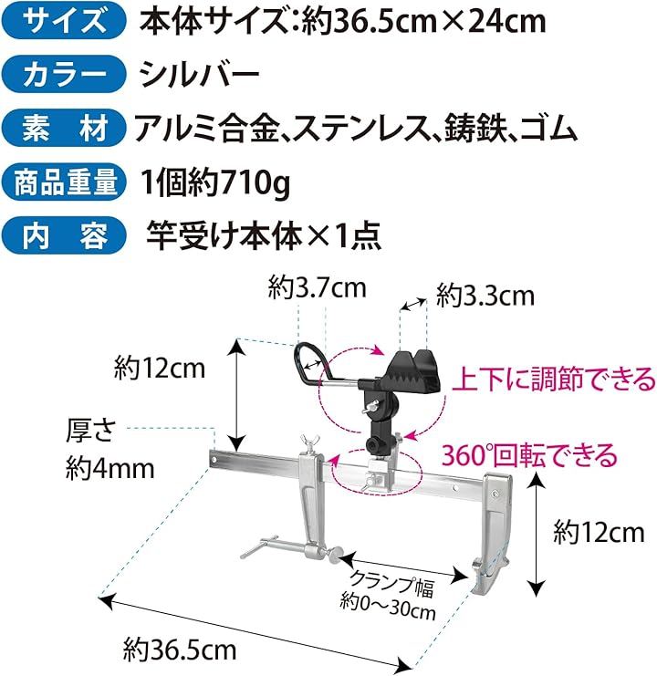 「サイズ」 本体サイズ:約36.5cmx24cm 「カラー」 シルバー 「素材」 アルミ合金、ステンレス、鋳鉄、ゴム 「商品重量」 1個約710g 「内容」 竿受け本体x1点 *ネジの位置は変わる場合があり、利き手によっては回しにくい可能性もあります。