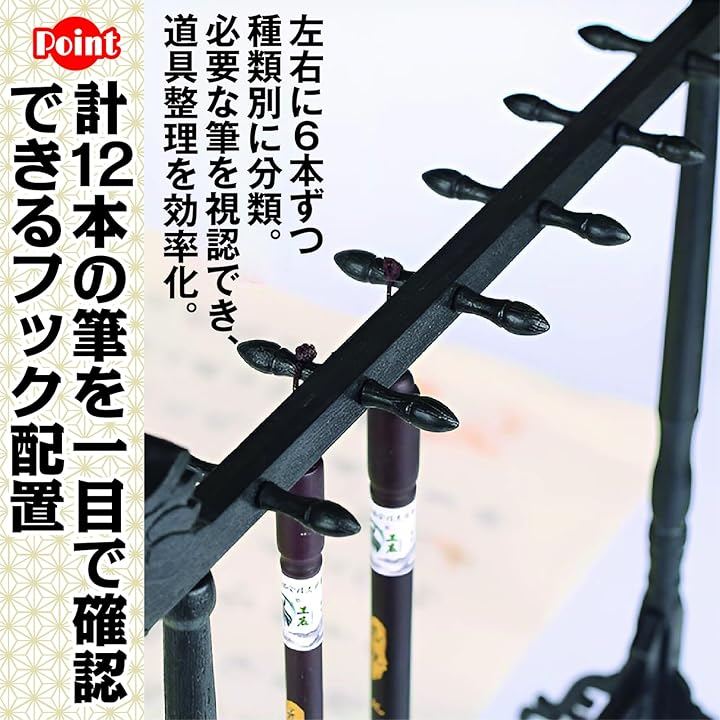 左右に6本ずつ、計12本のフックが配置されており、太さや長さの異なる筆を一覧できるように掛けることができます。