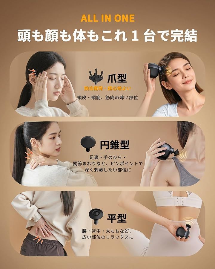 さらに、広域用の平型、一点集中用の円錐型と、全3種のアタッチメントで全身を網羅。