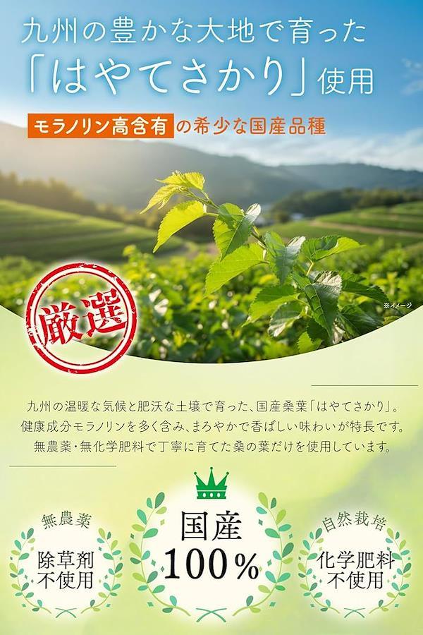 「国産100%の贅沢」九州の豊かな大地で育った希少品種「はやてさかり」の桑の葉を100%使用した桑の葉茶です。