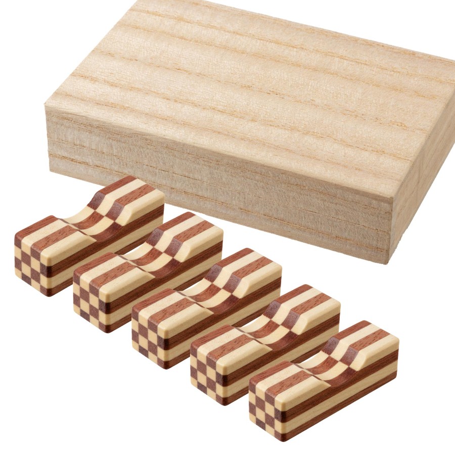 箸を置く、その所作まで整える。箱根の伝統「寄木細工」で仕立てた、市松模様の箸置き。無垢寄木ブロックを削り出し、日常使いしやすい仕上がりに。5cmの扱いやすいサイズで、普段の食卓から来客時まで。7色から選べる楽しさと、並べたときの美しさも魅力です。