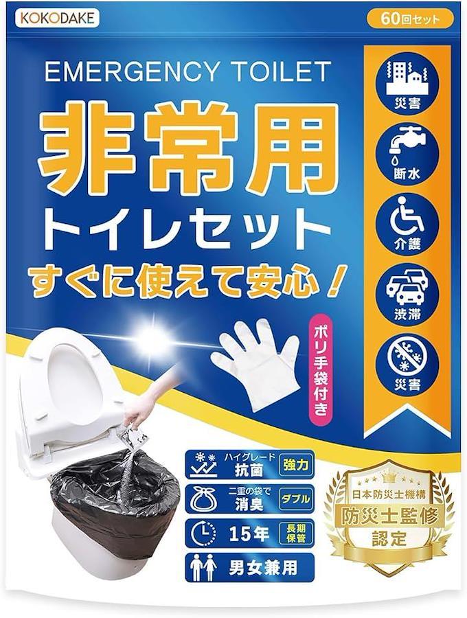 「防災グッズの必需品。 水の要らない非常用トイレセット」販売前から大好評の災害時のプロが厳選した非常用トイレセットがついに登場。 KOKODAKE 非常用トイレセット があれば、取り付けも簡単、処理にも困らないため非常時でも安心です。