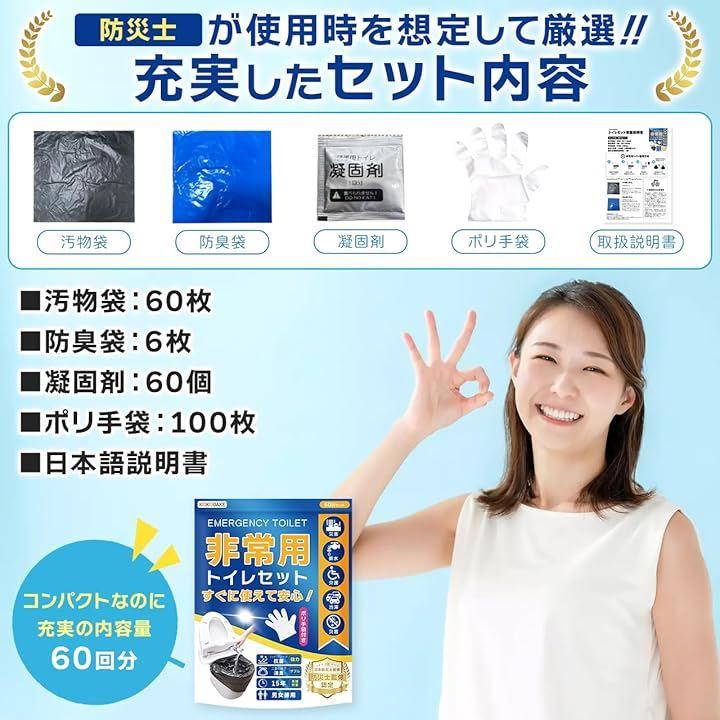 「セット内容」<60回分セット>衛生的な手袋100枚、汚物袋60枚、防臭袋6枚、ハイグレード凝固剤60包、日本語説明書が同梱されています。