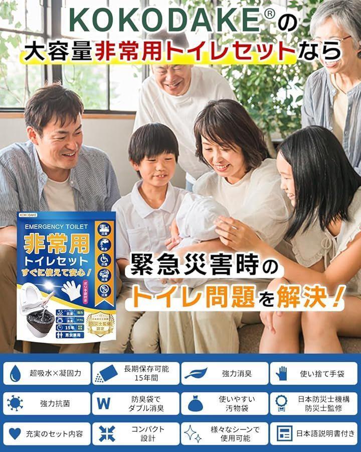 「防災グッズの必需品。 水の要らない非常用トイレセット」販売前から大好評の災害時のプロが厳選した非常用トイレセットがついに登場。 KOKODAKE 非常用トイレセット があれば、取り付けも簡単、処理にも困らないため非常時でも安心です。