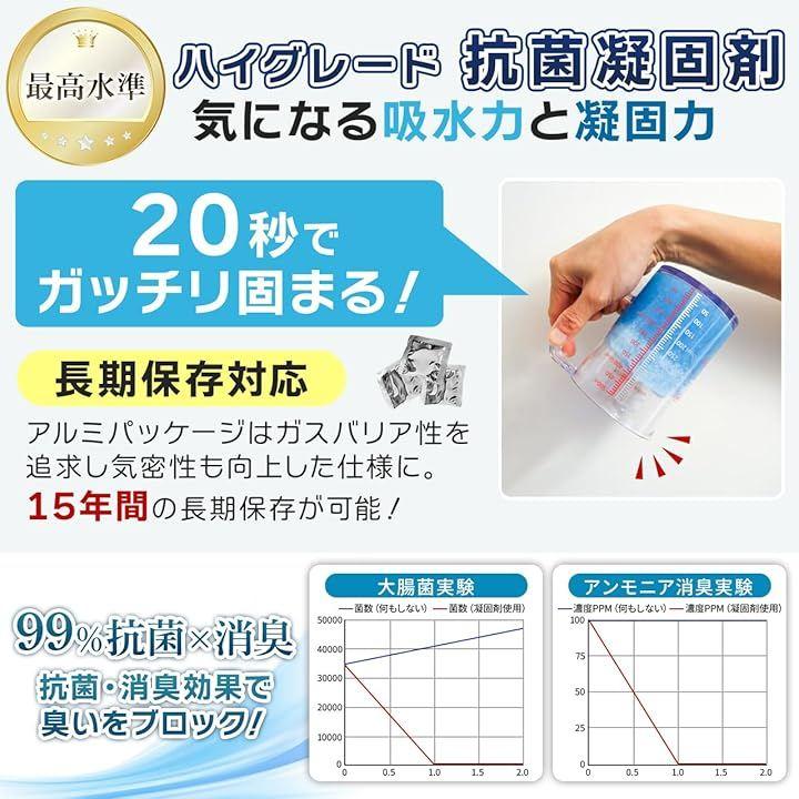 大容量凝固剤が排泄物をしっかり固化し、厚手の防臭袋で臭い漏れをブロックします。