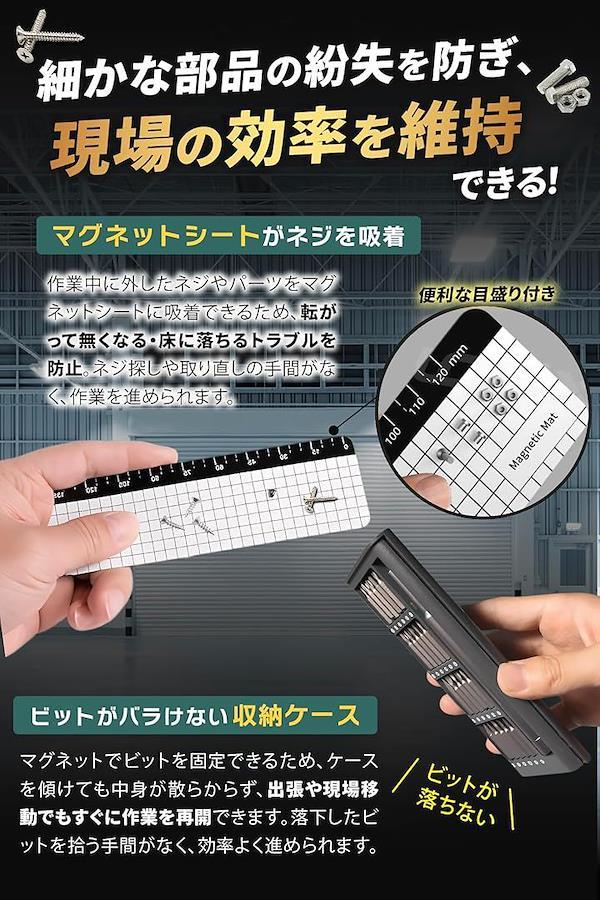 「三重磁気設計」 ドライバー先端・ビット収納・マグネットシートの3段階で磁力を活用。