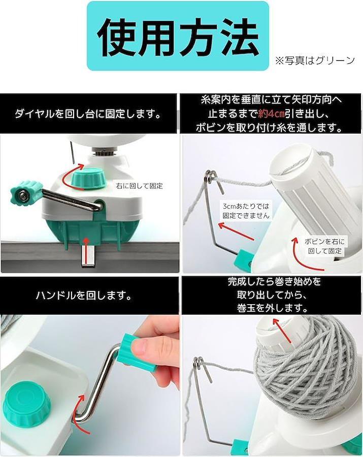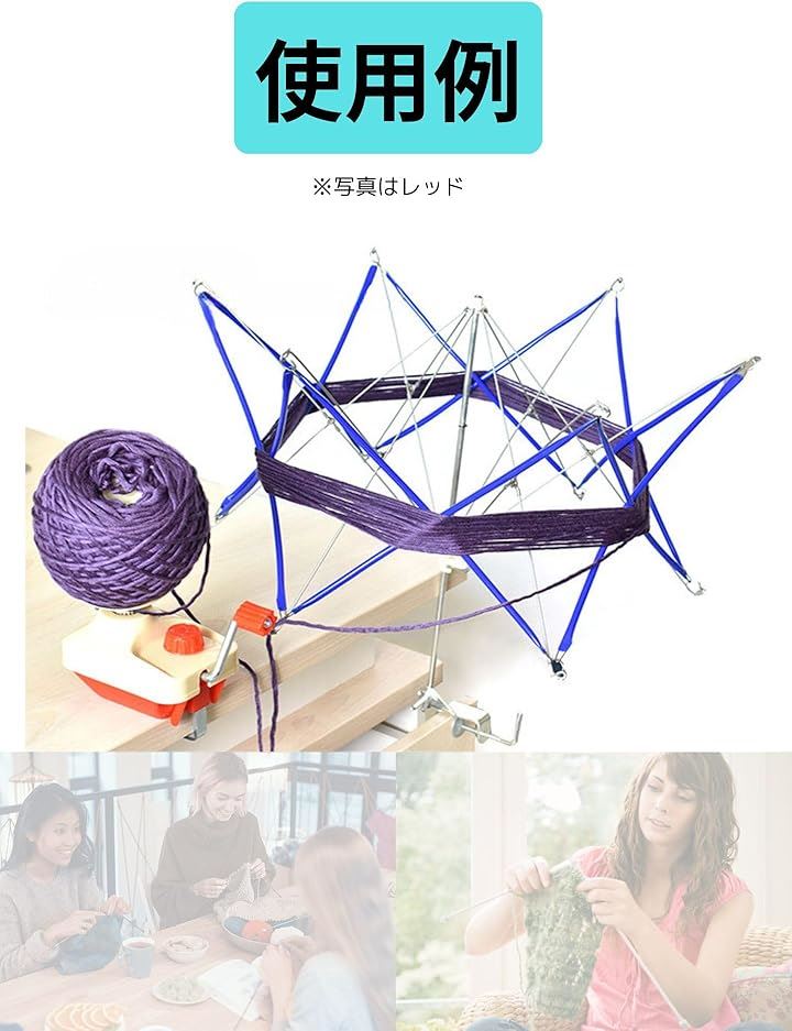 「使用方法」商品をテーブルの端にロックして、巻線筒を取り付けて、糸案内(ワイヤー)を垂直に立て、約4cm止まるまで強めに引っ張って、糸をワイヤーに通してハンドルをグルグル回すと毛糸が巻けます。