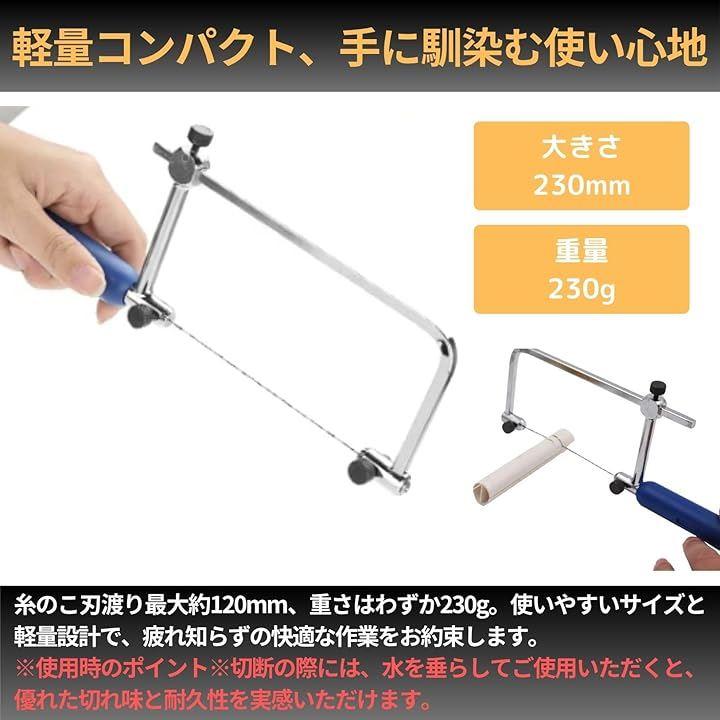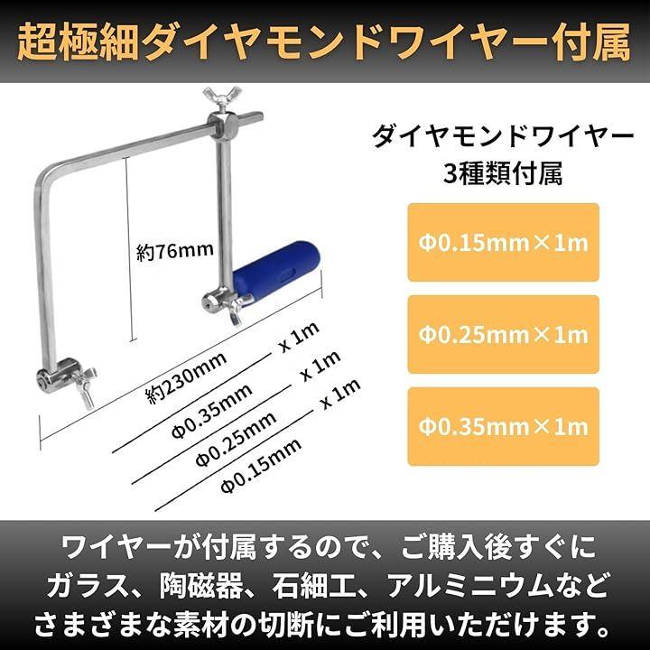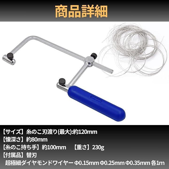 「仕様」サイズ:糸のこ刃渡り(最大):約120mm 懐深さ:約80mm 糸のこ持ち手:約100mm 重さ:230g 付属品:替刃 超極細ダイヤモンドワイヤー Φ0.15mm Φ0.25mm Φ0.35mm 各1m
