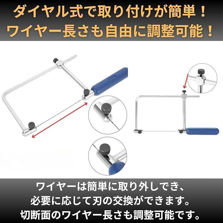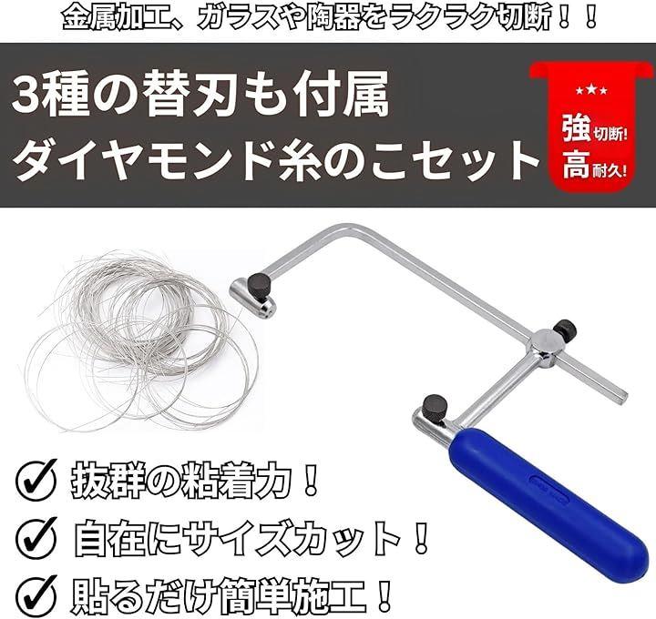 「ダイヤモンドワイヤーの切れ味が光る、ガラスや陶器をラクラク切断。3種の替刃で多彩な用途に対応、使いやすい糸鋸セット。」高品質なダイヤモンドワイヤーと替刃がセットになった、ガラス、陶器、石細工に最適な糸鋸(糸のこ)です。