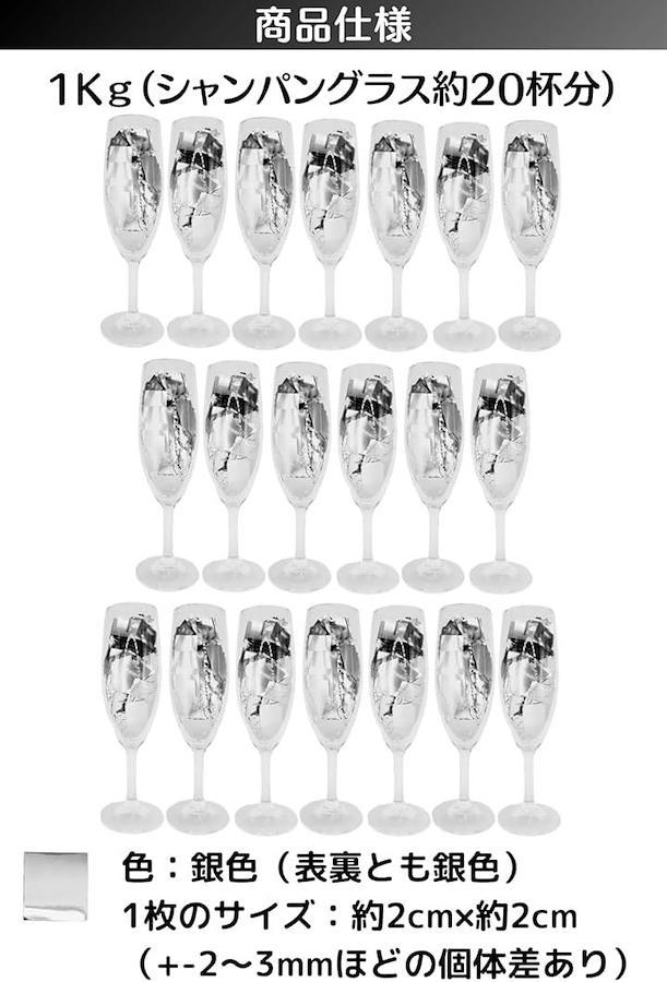 「商品仕様」カラー:銀色(クロームシルバー) 表裏の両面とも銀色 1枚のサイズ:約2cmx約2cm(+-2~3mmほどの個体差あり) 内容量:1Kg 枚数:約60000枚 材質:PET超薄フィルム *非常に薄くて軽い素材ですので、ボリューム感が感じられない、又は、実枚数より少ないという印象を持つ方もいらっしゃいますので、余裕をもってご購入いただければと思います。