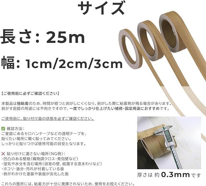 「“ちょうどいい細さ”が、貼りたい場所にぴったり」 このテープは市販の太すぎる木目テープと違い、1cm・2cm・3cmの細いサイズ展開。