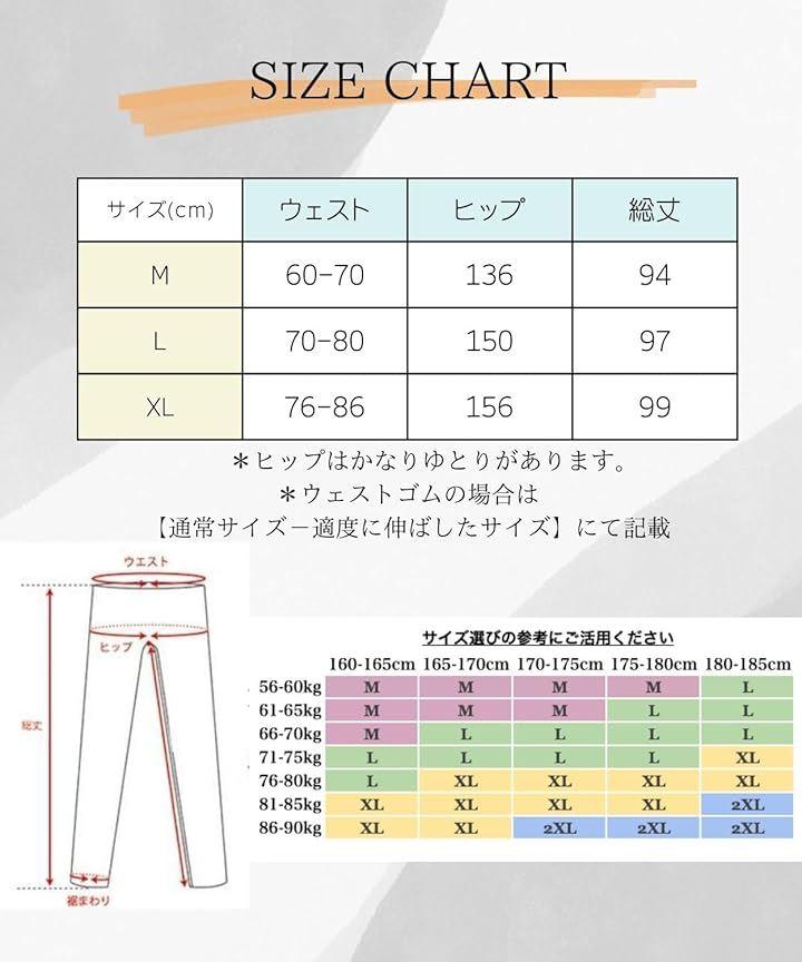 「M」ウエスト60-70/ヒップ136/丈94 「L」ウエスト70-80/ヒップ150/丈97 「XL」ウエスト76-86/ヒップ156/丈99