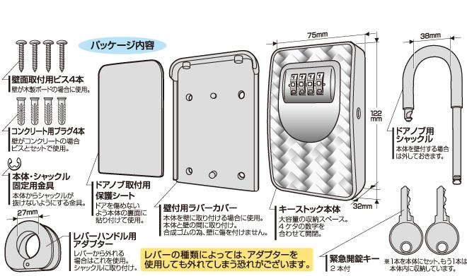 施錠、解錠は普段はダイヤル式でキ―は不要、番号忘れや緊急時の場合は緊急開錠キ―で解錠出来ます。暗証番号は可変式で任意の番号にセット可能で緊急開錠キ―は2本付きです。大容量の収納力で大型の自動車キーやカードキー、種類によっては複数の鍵を一度に収納可能です。賃貸住宅、事務所等の鍵の管理、受け渡しや、住宅展示場等、不動産業の物件管理、緊急時にご家族への鍵の受け渡しに最適です。 本体サイズ7.5×18×3.5