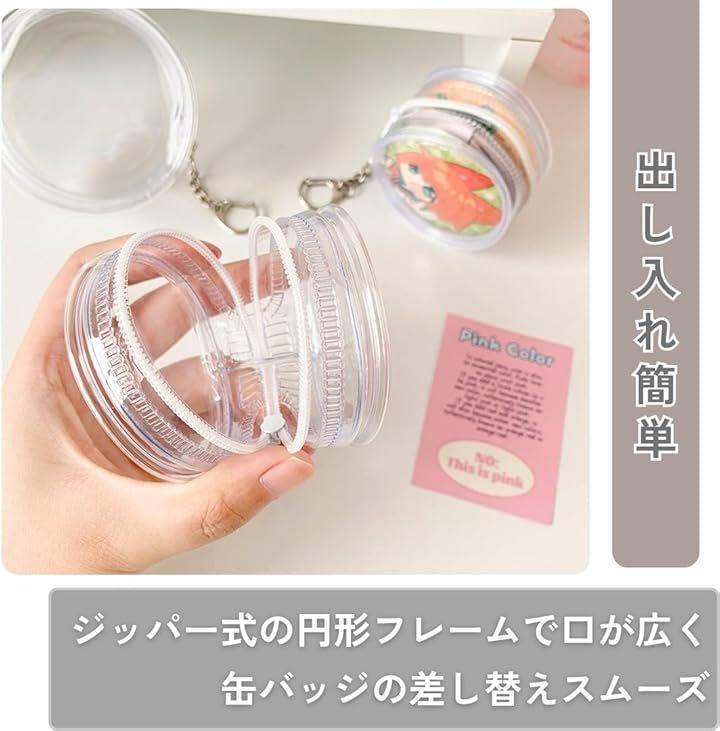 「出し入れ簡単」ジッパー式の円形フレームで口が広く開き、缶バッジの差し替えや位置調整がスムーズ。