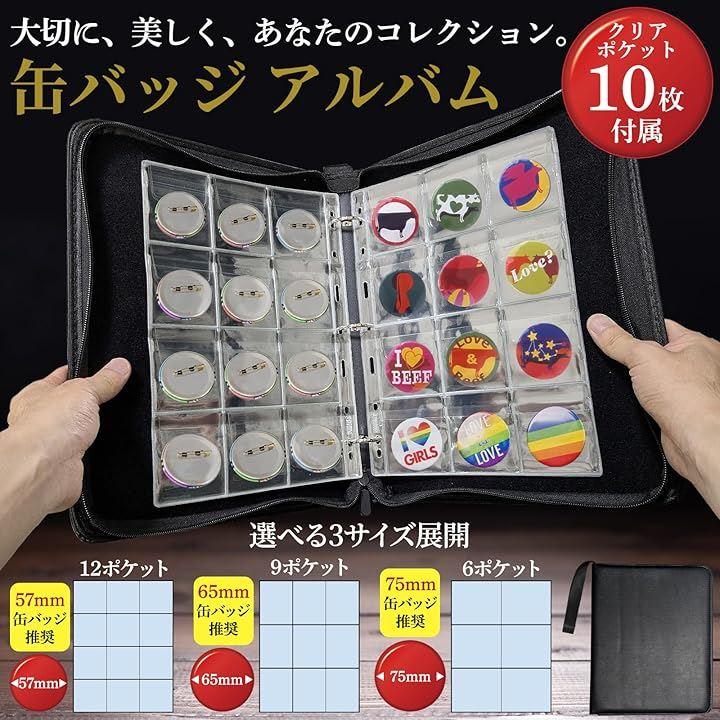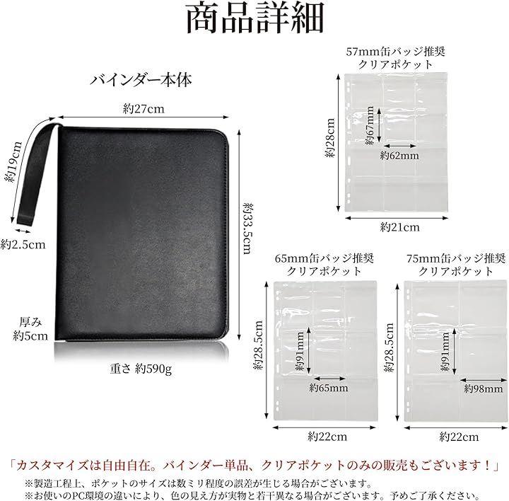 「品名」「缶バッジ 収納」「缶バッジケース」「缶バッチケース」「缶バッジカバー」 「クリアポケットバリエーション」57mm缶バッジ推奨クリアポケット/65mm缶バッジ推奨クリアポケット/75mm缶バッジ推奨クリアポケット 「バインダーサイズ」高さ約33.5cmx幅約27cmx厚み約5cm 「バインダー重量」約590g 「材質」バインダー本体:PUレザー、クリアポケット:PP バインダー単品、クリアポケットのみの販売もございます。
